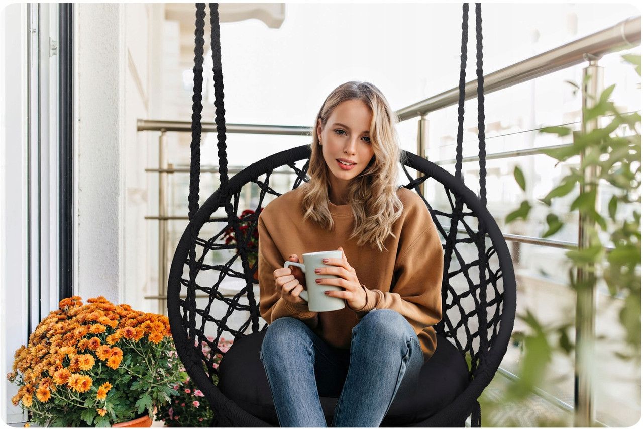 Зручне підвісне крісло в сучасному та актуальному стилі бохо. Це ідеальне доповнення для інтер'єру будинку або квартири, яке також чудово виглядатиме в саду чи на терасі. Хвилина релаксу в кріслі-гойдалці на балконі — це також чудова ідея!