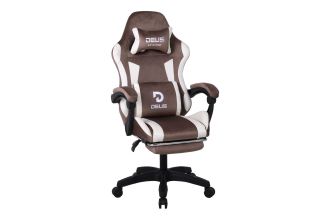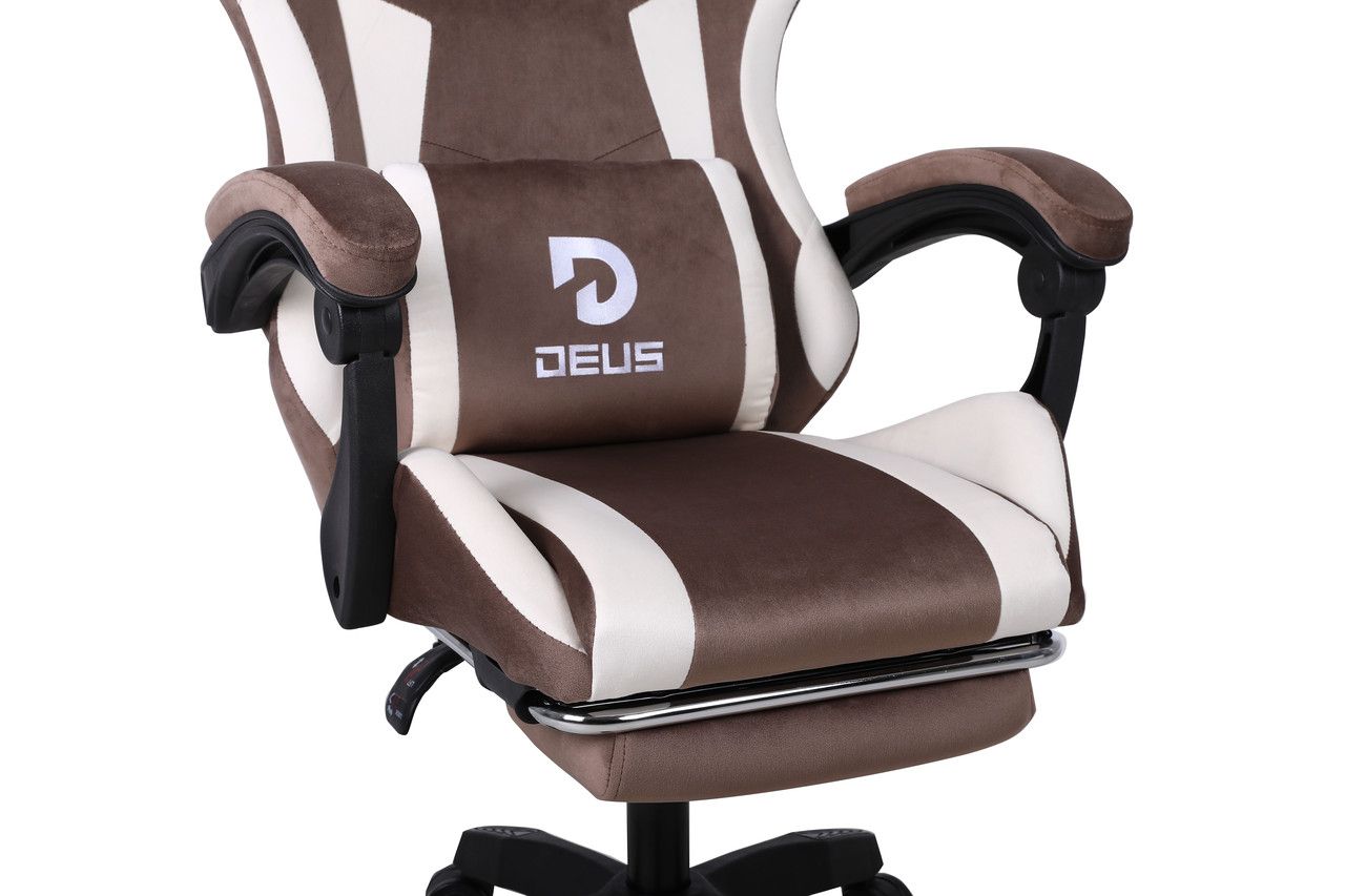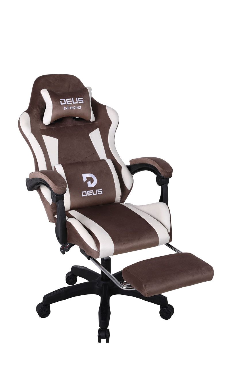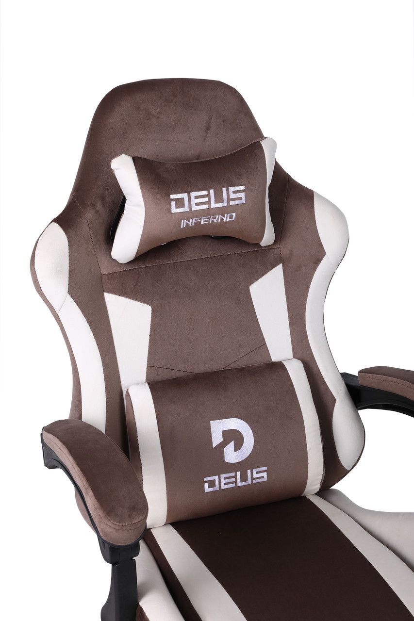 Ігрове крісло DEUS Inferno із замші - комфорт, стиль і максимальна зручність Ігрове крісло DEUS Inferno - ідеальний вибір для геймерів і офісних працівників, які цінують комфорт, функціональність і сучасний дизайн. Завдяки висувній підставці для ніг, регульованій спинці та високоякісній замшевій тканині крісло забезпечує неперевершений комфорт навіть під час тривалого використання. Сучасний дизайн та унікальні матеріали Розкішна замша - замість традиційної екошкіри крісло виготовлене з м'якої та приємної на дотик тканини, яка дихає, запобігає надмірному нагріванню та додає елегантності всьому дизайну. Ігровий стиль - динамічні лінії та спортивний вигляд роблять DEUS Inferno ідеальним елементом сучасного ігрового робочого місця. Максимальний комфорт завдяки ергономічним рішенням Регульована спинка - можливість нахилу дозволяє знайти ідеальне положення як для гри, так і для відпочинку. Висувна підставка для ніг - дозволяє комфортно відпочити ногам, зменшуючи м'язову напругу та покращуючи кровообіг. Ідеально підходить для відпочинку після інтенсивної ігрової сесії. Ергономічні подушки - поперекова подушка та подушка підголівника забезпечують належну підтримку хребта, зменшуючи ризик виникнення болю в спині. Фіксовані підлокітники - міцні та правильної форми, вони забезпечують стабільну підтримку для рук. Розширена функціональність Регулювання висоти сидіння для ідеального пристосування до вашого столу. Поворотний механізм на 360° для повної свободи рухів. Міцна металева конструкція для довговічності та стабільності. М'які ігрові коліщатка - тихе та безпечне пересування Високоякісні м'які коліщатка не дряпають підлогу і гарантують плавне переміщення на будь-якій поверхні. Спеціальне покриття запобігає ковзанню та забезпечує відмінне зчеплення з поверхнею. Міцна конструкція роликів означає, що вони прослужать довго навіть при інтенсивному використанні. Технічні характеристики: Максимальна висота: 125 см Діапазон регулювання висоти: 10 см Максимальна ширина з підлокітниками: 67 см Висота спинки 75 см Ширина спинки 56 см Глибина сидіння 50 см Ширина сидіння 50 см Діапазон регулювання висоти сидіння 42-52 см Ширина основи: 67 см Колір: білий та коричневий М'яка замшева тканина Висувна підставка для ніг для додаткового комфорту Плавно регульована спинка Дві ергономічні подушки (поперекова та підголовник) Поворотний механізм на 360 градусів Міцна та стійка конструкція