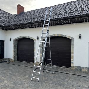 Алюмінієва драбина 3х10 HIGHER - технічний опис: Кількість сходинок: 3x10 Максимальне навантаження: 150 кг Модель: 3x10 / 3 елементи по 10 сходинок на кожному елементі Транспортна довжина: 2,87 м Максимальна довжина драбини (в розкладеному вигляді): 6,45 м Максимальна робоча висота: 7,30 м (у положенні приставної драбини) Вага: 15 кг Бічний профіль: 70x20 мм + 60x20 мм Довжина стабілізатора: 80 см Сходинки 25х25 мм Багатофункціональні драбини HIGHER характеризуються високою універсальністю і довговічністю. Драбини виготовлені з алюмінію найвищої якості, стійкого до погодних умов. Драбини легкі, що полегшує їх переміщення, і в той же час дуже міцні (вантажопідйомність: 150 кг). Міцні та довговічні стійки Рифлені протиковзкі сходинки Протиковзкі ніжки Поліамідні ролики Протиковзкий стабілізатор Багатофункціональне використання Можна розміщувати на сходах Система захисту від стирання направляючих Бічний профіль: 70x20мм + 60x20мм Міцні сходинки Протиковзькі сходинки перерізом 25x25 мм, що використовуються в драбині HIGHER, кріпляться до профілю за допомогою 32-кратного пресування. Цей процес гарантує міцне з'єднання та естетичну обробку сходинок. Драбина набуває додаткової стійкості та міцності. Сталеві направляючі Оцинковані, тиснені, пофарбовані порошковою фарбою сталеві направляючі запевнюють безпечне використання. Завдяки міцним направляючим елементи драбини утримуються в правильному положенні, що значно підвищує безпеку при виконанні робіт на висоті. Поліамідні направляючі ролики У драбинах HIGHER застосовуються найкращі технологічні рішення, одним з яких є використання спеціальних поліамідних роликів. Завдяки роликам подовження драбини стало набагато простішим, а проблема стирання алюмінієвих профілів вирішена. Плавне і легке висування драбини на потрібну довжину без застосування сили або сторонньої допомоги. Безпечна розстановка Міцні, стійкі до погодних умов поліпропіленові ремені запобігають неконтрольованому розсуванню драбини. Лямки кріпляться за допомогою спеціальних рухомих пряжок. Блокувальні штифти Сталеві штифти з поліамідним покриттям захищають другий і третій елементи від надмірного розкладання. Протиковзкі ніжки Ніжки драбини і стабілізатора оброблені протиковзким гумовим пластиком, щоб запобігти ковзанню. Стабілізаційна планка на драбинах HIGHER фіксується 4 гвинтами для додаткової безпеки. Пластикові заглушки встановлені на кінцях драбини і захищають гострі кінці профілів драбини від ненавмисного травмування. Крім того, драбина оснащена захисними заглушками зі спеціальною посиленою конструкцією рами, виготовленою з високоміцного пластику. Спеціальні заглушки додатково виконують дуже важливу функцію: вони захищають місце кріплення стабілізатора до стійок драбини. Це запобігає тертю металу до металу.