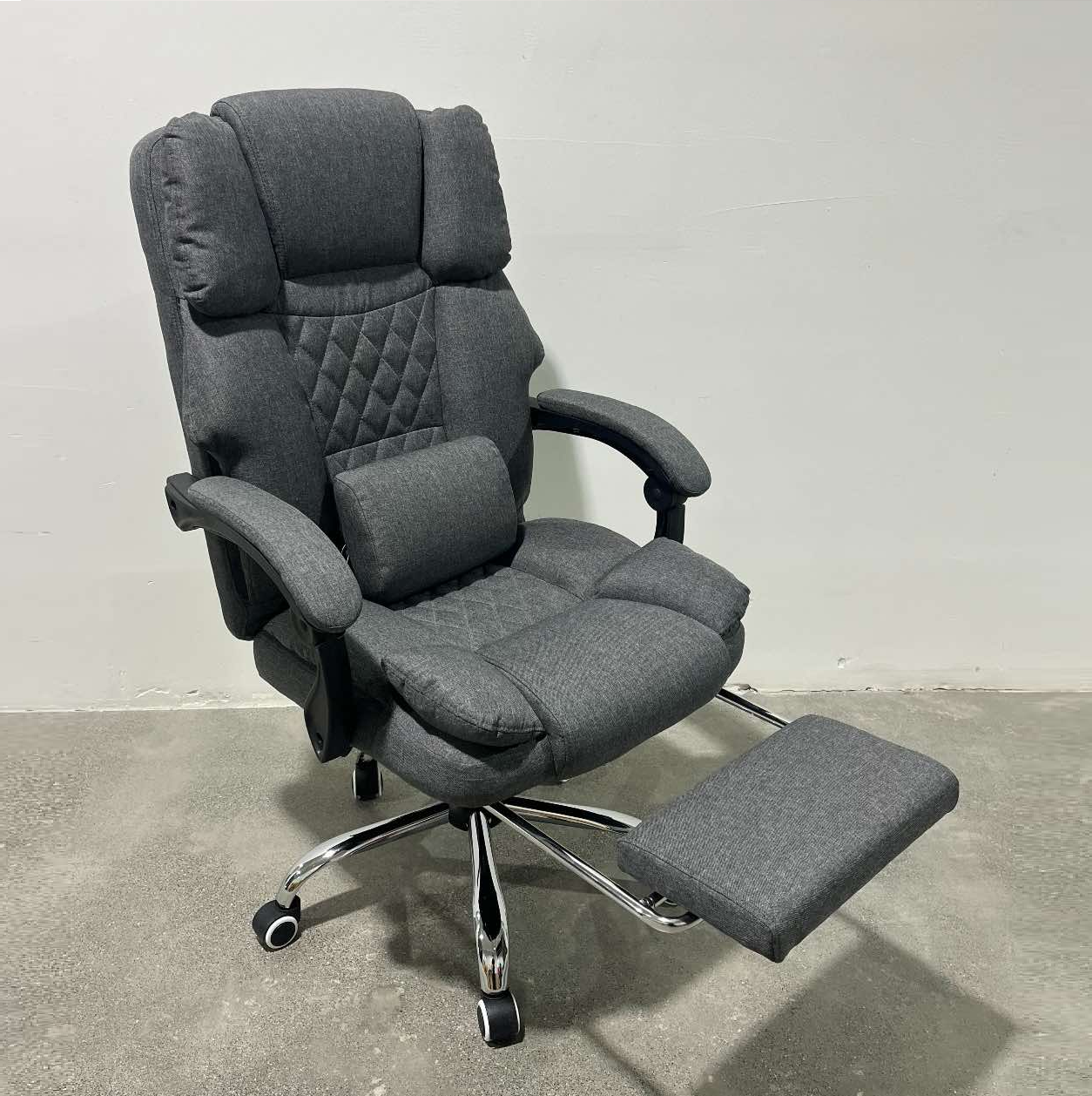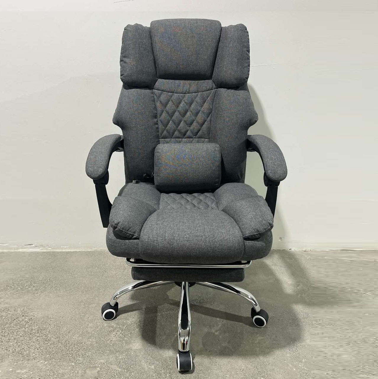 ОФІСНЕ КРІСЛО MASTER КО32 ✓ ЗРУЧНІСТЬ - зручні, широкі сидіння та спинка ідеально підходять до силуету сидячої людини. Високий вбудований підголівник і відповідний профіль гарантують функціональність і підтримку голови. Підлокітники правильної форми, що підвищує комфорт використання, а також навантаження на хребет. ✓ ВИСУВНА ПІДСТАВКА ДЛЯ НІГ - додатково крісло має висувну підставку для ніг, заховану під сидінням, що забезпечує комфорт використання та покращує кровообіг в ногах. Правильне положення мінімізує втому тіла і усуває м'язовий біль, викликаний неправильним положенням. ✓ ГУМОВІ КОЛЕСА - використання гумових коліс допомагає запобігти подряпинам на підлозі, і порізам на килимі. Колеса роблять підлогу безпечною, а переміщення на них тихе та комфортне. П'ятизіркова основа з подвійними коліщатками забезпечує стабільне пересування. ✓ РЕГУЛЮВАННЯ - крісло можна підлаштувати під індивідуальні потреби, завдяки чому ми отримуємо неймовірний комфорт використання. Висота сидіння регулюється. Також регулюється кут нахилу спинки (його можна зафіксувати в заданому положенні). ✓ ШВИДКИЙ І ЛЕГКИЙ МОНТАЖ - весь процес складання крісла швидкий, легкий і приємний. Це не повинно тривати більше 10 хвилин. ХАРАКТЕРИСТИКИ: колір матеріалу: графітовий; матеріал: тканина; хрестовина: хром; колеса: прогумовані; розміри (довжина/ширина/висота): 65/65/118 см; регулювання висоти крісла: 110-118 см; максимальне навантаження: до 130 кг; вага крісла: 16 кг; вага з упаковкою: 17,8 кг.